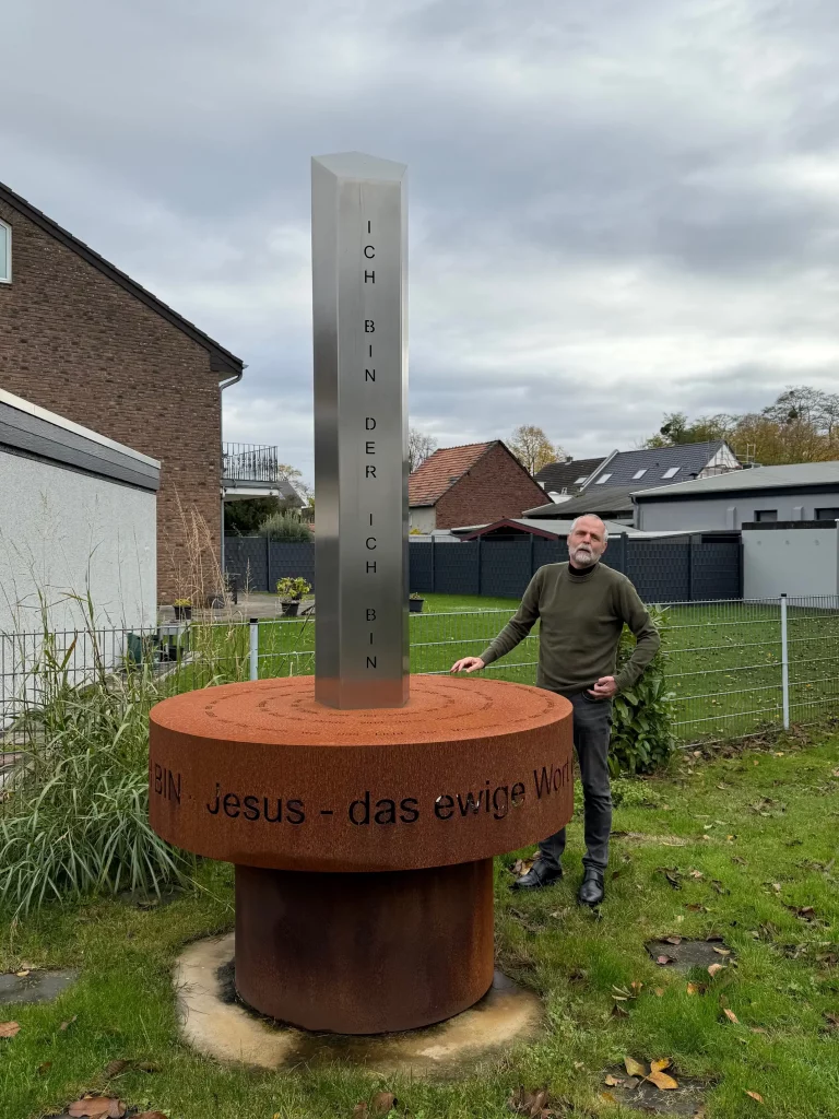 Cortenstahl ist mein Lieblingsmaterial, dass ich auch in anderen Kunstwerken im öffentlichen Raum verwendet habe. Je nach Witterung bilden sich unterschiedliche Farbnuancen. Der Edelstahlkörper sollte sich bewusst abheben – da sich darüber das „göttliche Potenzial“ erhebt.