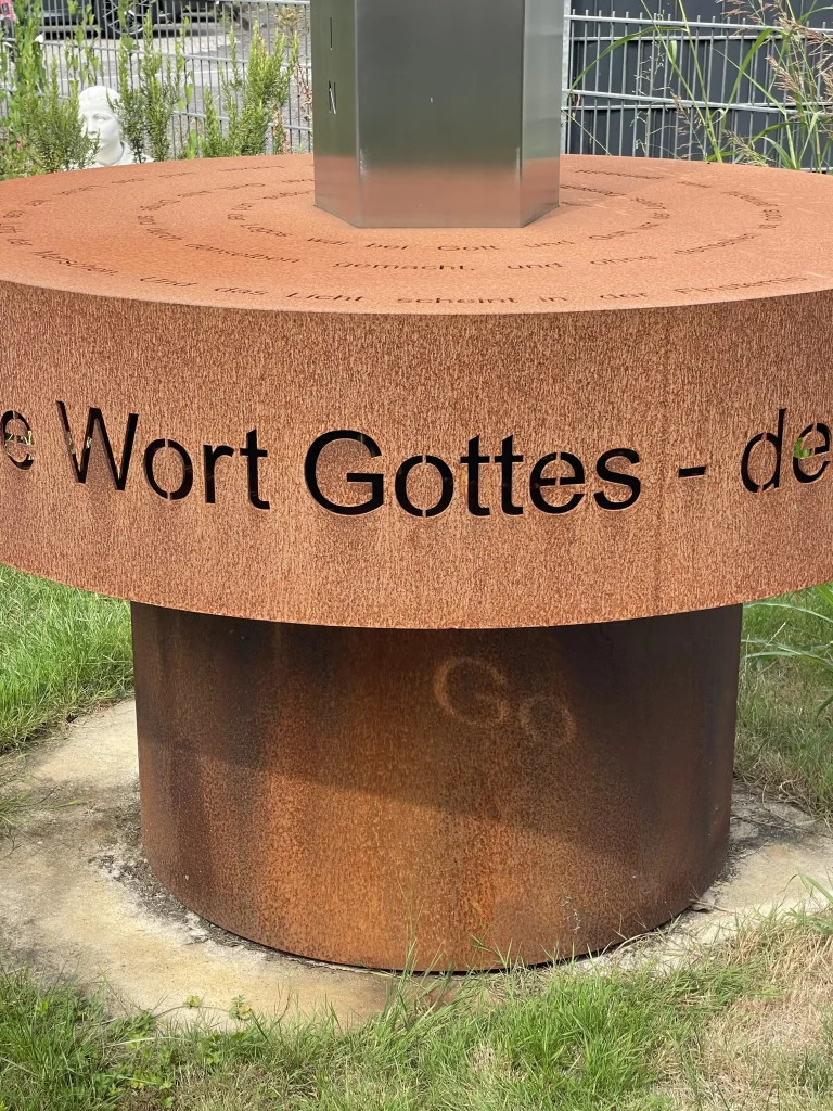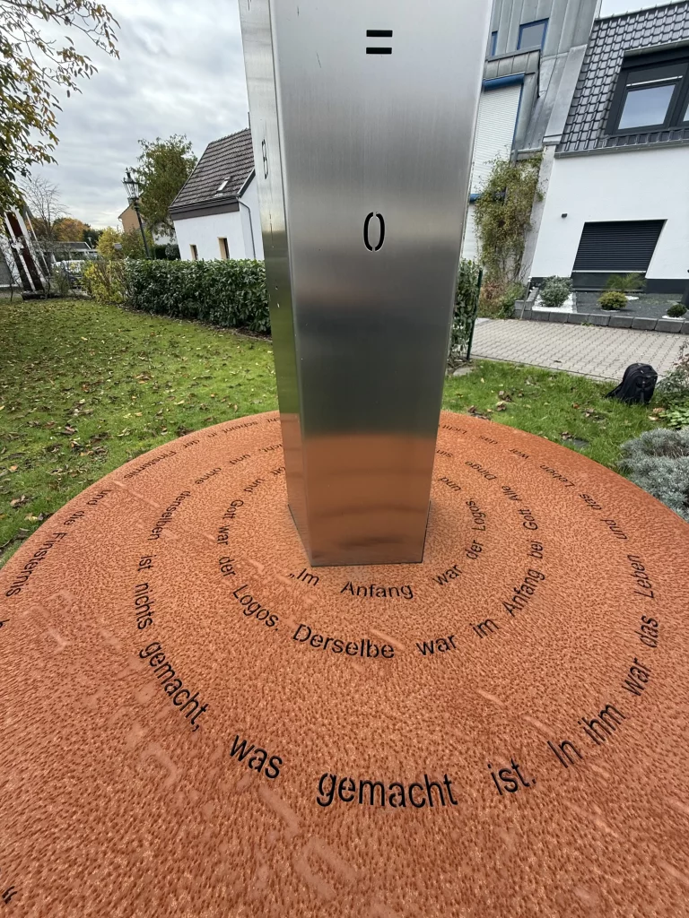 Dadurch, dass die Buchstaben ausgestanzt sind, gibt es interessante Lichteffekte. Bei einem bestimmten Sonnenstand liest man auf dem Basiszylinder „Gott“ – man kann sagen: Gott erscheint. An einem anderen Tag las ich einmal „Go“ [6] – und dachte sofort an den Missionsbefehl: „Gehet hin in alle Welt …“ (Mt 28,19). Die Hälfte von „Gott“ ist „Go“. War das so intendiert?