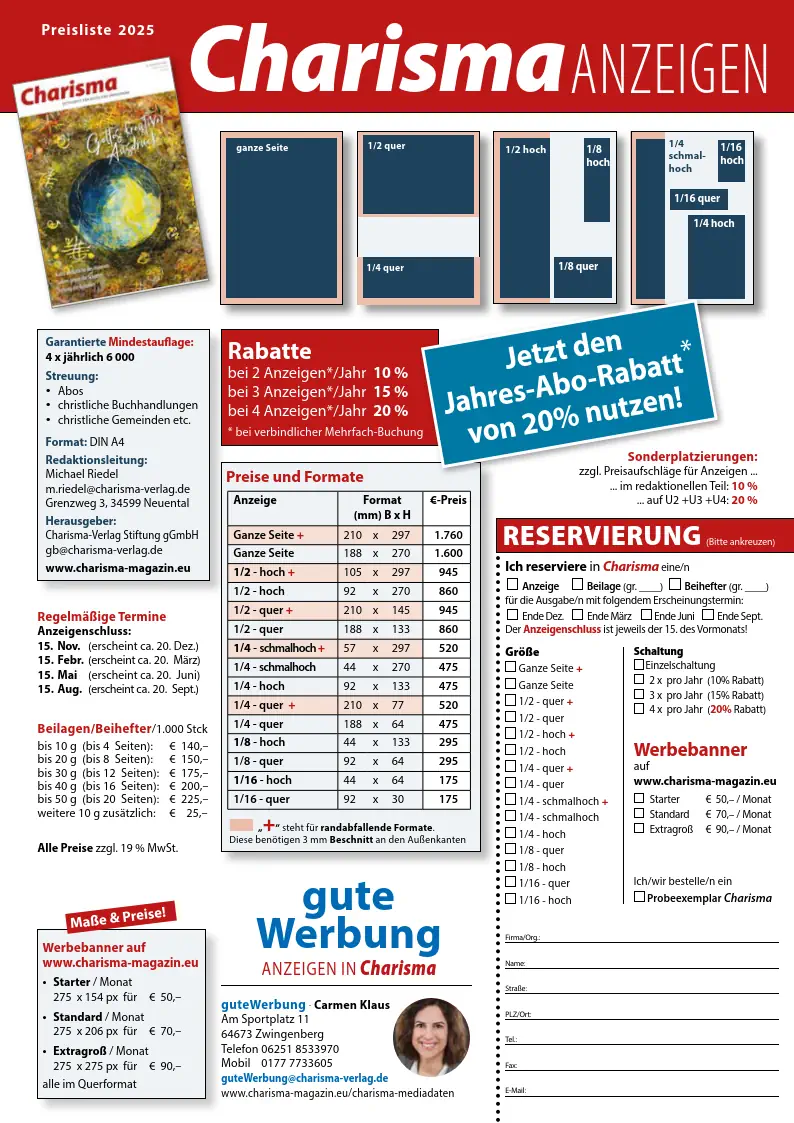 Für Buchungen und Fragen stehe ich gerne zur Verfügung: gutewerbung@charisma-verlag.de (Carmen Klaus)